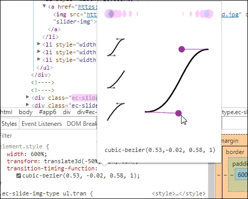 如图所示,没改变曲线一下,上面紫色的球,就会根据曲线进行运动,给开发者提供一个动画的参考,下面也会生成相关曲线的代码。这个也是做出优美的css3动画的重要一步!