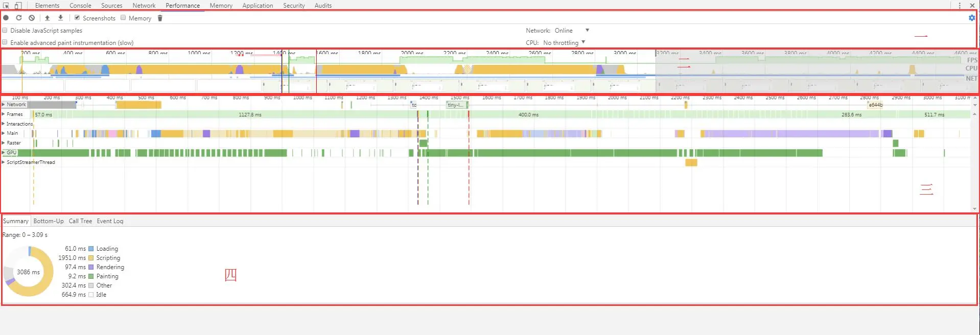 这个图是招瓶颈直观的方式之一!比如上图,看到Scripting占了大部分时间,就是在执行js上,或许有待优化!