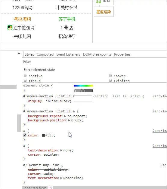 五:被选择元素的所有的涉及样式,页面的样式可以在这里随意的修改!六:被选择元素所有计算后的样式(有些样式会重复,覆盖,在这里就显示覆盖后的样式)以及盒模型!七:被选择元素的事件(这个貌似只要知道就行了,至少我没用过)