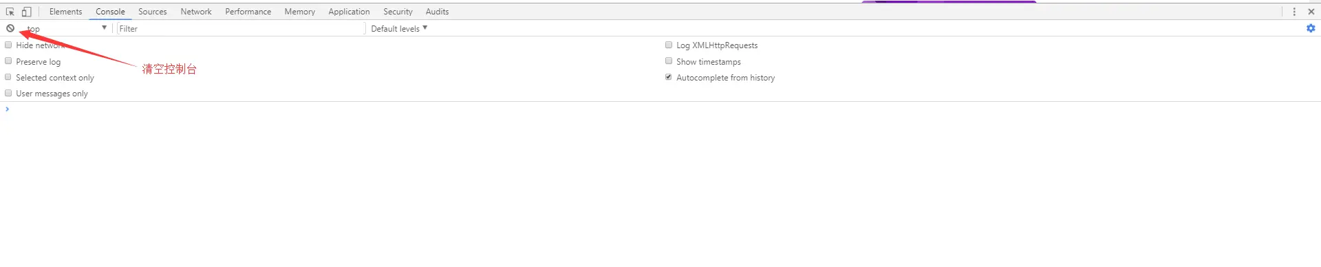 console这个界面,平常开发用得非常多,调试JS代码的时候,经常需要在console输出变量或者节点。个人使用上,除了在控制面板内写jS外,用得最多的就是上图,指向的那个按钮,点击一下就清空面板。这个感觉比console.clear()更快。