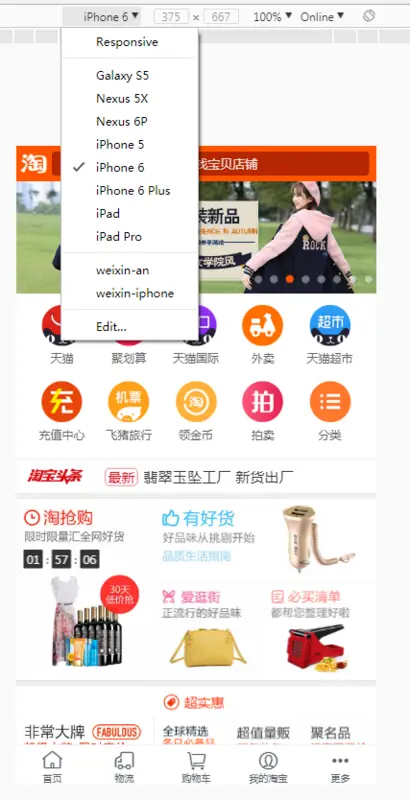 这个想必大家会经常用到,特别是切图调整样式的时候,这个我就按照图上的编号简单说一下!一:就是页面上的元素,鼠标放到上面,在页面上会出现(二)的变化,方便查找元素!三:点击这个箭头,然后就能在页面上快速选择元素!四:浏览进入移动端适配模式,如下图。可以更换各种机型,或者点击‘Edit’添加其他机型或者自定义机型!旁边的‘Online’就是模拟网络的各种情况,‘Online’旁边的图标就是横竖屏切换!这里简单提一下,大家按需使用!
