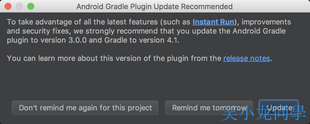 目前遇到这些坑,欢迎一起吐槽您在升级开发遇到的坑,这次升级又折腾了很久。另外如果需要gradle-4.1-all.zip 文件,公众号「吴小龙同学」聊天界面回复「 gradle-4.1-all」获取。