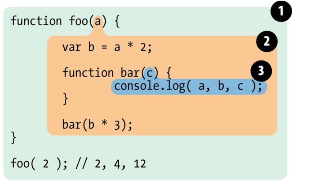 如果a,c 都存在作用域bar(...),foo(...)作用域中,console.log(...)即不需要到foo的外部作用域中去查找变量。