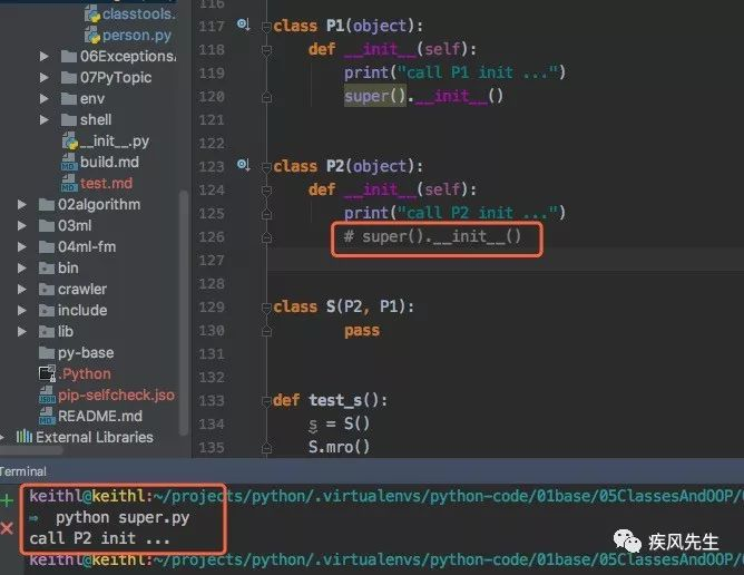 P2和P1是两个没有任何关系的基类,但是在S类的MRO中,P2的super()便是P1(),因此在P2中使用super()会调用到P1的方法