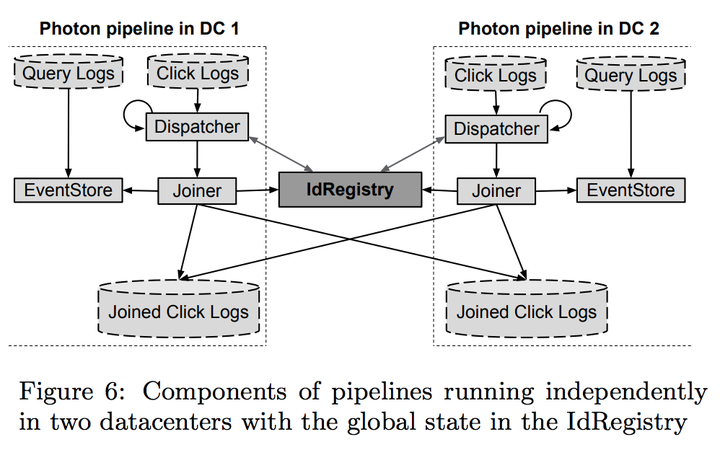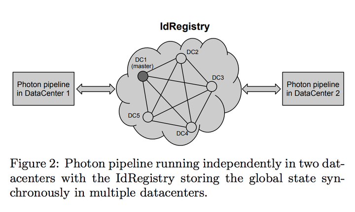Photon的核心是一个基于Paxos的ID registry。基于paxos一个原因就是这个系统得有高的availability,而且被join的时间可能会被好几个不同的数据中心的机器处理。这个数据库里面存的最终要的东西就是,在过去N天里面,有哪些事件的ID是被join了的。这个N可大可小,具体看业务需求(offline conversion的话N就要大,只是点击的话N就可以很小)。