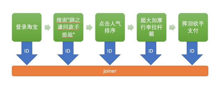 我们先来解释一下joiner的概念是什么。假设我是一个吃瓜群众,我登录了淘宝,这个登录是第一个事件。然后我搜索了“薛之谦同款手提箱”,这是第二个事件。我点击了人气排序,这是第三个事件。之后我点击了“超大加厚行李拉杆箱blablabla”,这是第四个事件。然后我点击了立即购买,这是第五个事件。这个过程中,有些厂商会在“搜索薛之谦同款手提箱”那个关键词下面打广告,那么这个时候如果我点击了这个关键词下面的竞价词条,淘宝是要跟厂商收广告费的。在整个过程中,淘宝得知道
