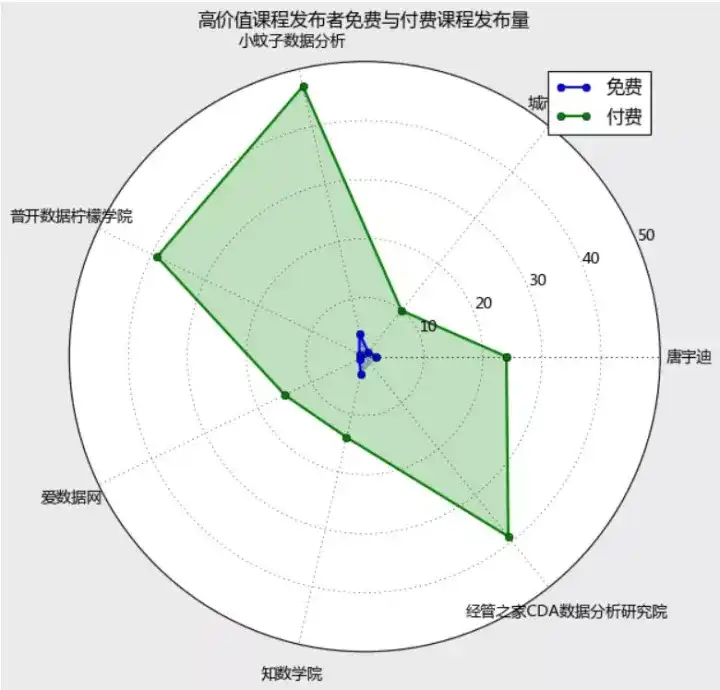 以上雷达图可以看到,凡是付费课程数比较多的发布机构,都会贡献一定的免费课程资源,小蚊子数据分析和知数学院提供了相对较多的免费课程数量,但总体而言,这些大机构的付费科课程数量与免费课程数量基本相差10倍左右。