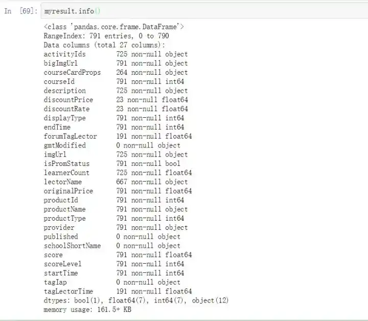 以上是本次爬取数据表,按照这些字段属性,之前曾经做过一期网易云课堂Excel模块课程抓取与可视化的推送。因为云课堂的课程信息字段基本一致,本次分析仍然 按照那个思路进行。