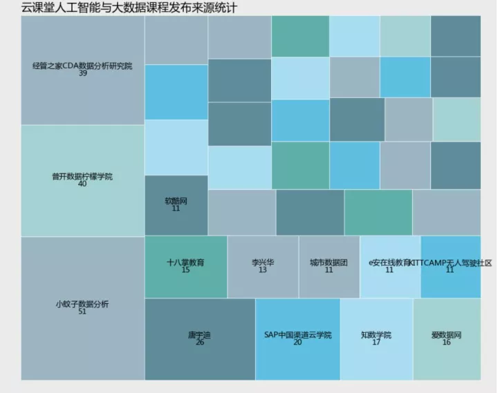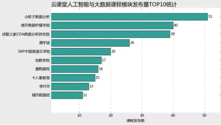 云课堂人工智能与大数据模块一共有791门有效课程,课程字段中提供了机构信息和教师信息,倘若机构信息与教师信息一致,那么基本可以认为课程是个人名义发布的,否则则是以机构名义发布的。(不一定客观,本次以代码练习为主)。