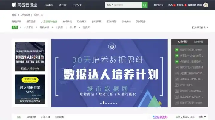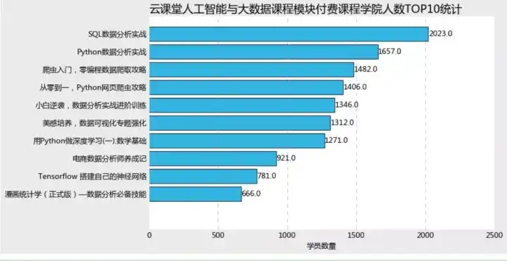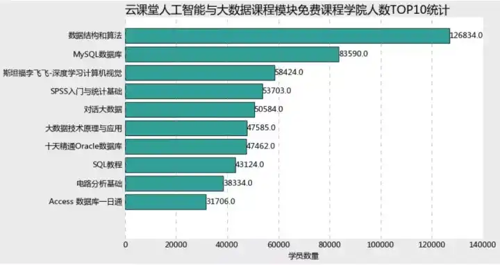 而反观免费课程模块,最具人气的是数据结构与算法,竟然达到了126000+的学院数量,第二名是MySQL数据库,用户量达到了83590,之后的8门用户量均在60000以下。有趣的是,免费课程的用户量top10中,竟然有4门数据库相关,可见数据库技能在数据科学中地位与重要性以及普及程度。