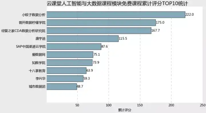 plt.title('云课堂人工智能与大数据课程模块免付费程累计评分TOP10统计',fontdict = {'fontsize':18},loc='left')