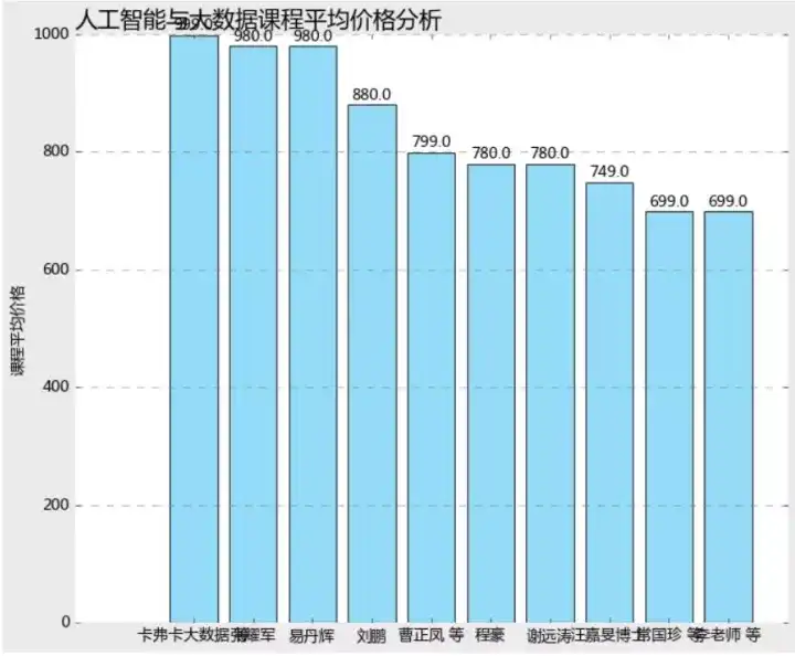 从课程平均价格来看,卡夫卡大数据、张耀军、易丹辉价格占据前三甲,分别为999、980、其他课程作者价格均在900以下。
