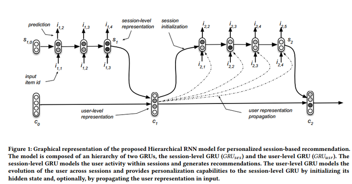 本文的贡献在于提出一种层次化的RNN模型,相比之前的工作,可以刻画session中用户个人的兴趣变化,做用户个性化的session推荐。