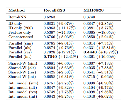 Parallel 并行更新item ID 和 feature 的模型达到最好的效果,Parallel shared-W和Parallel interaction 交互模型并没有好的效果,可能原因重复的序列信息加重了模型的训练负担。
