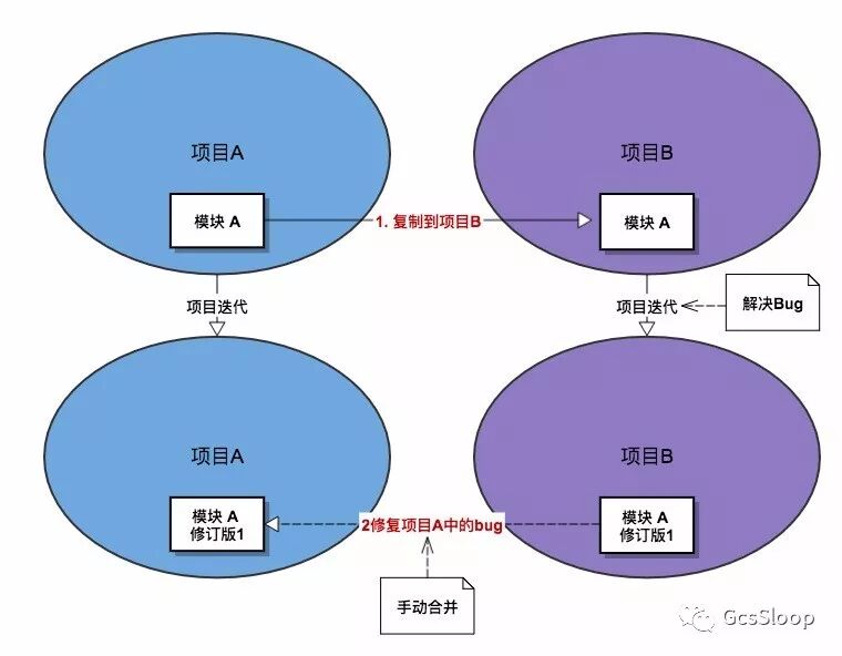 项目B开发了一段时间后发现模块A存在一个Bug,于是在项目B中对这个Bug进行了修复,等项目B告一段落,继续进行项目A开发时,想到了之前模块A中还存在这样一个问题,于是对照着项目B对项目A中对模块进行了修复。