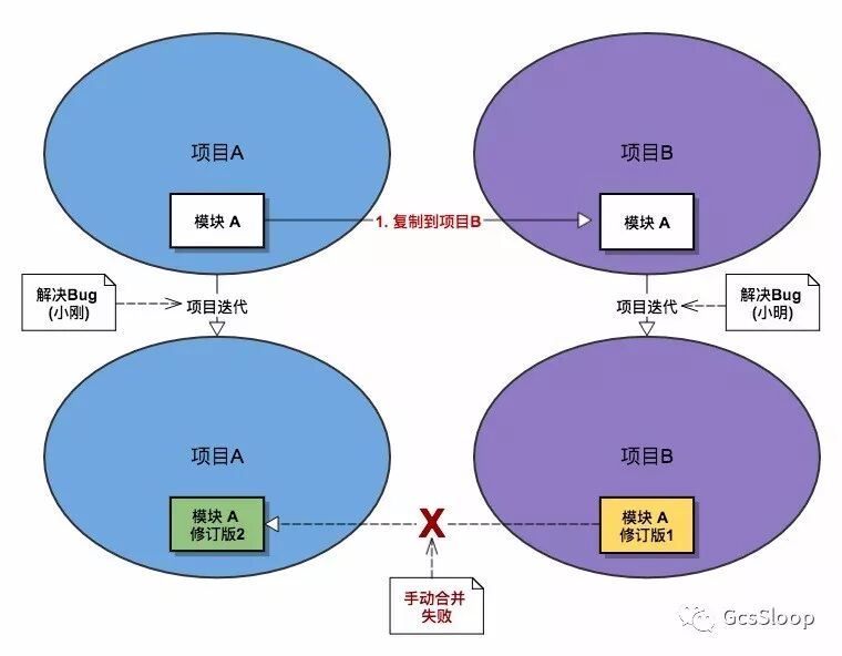 项目A开发了一段时间之后,又来了一个项目B,同样有这个需求,于是小明把之前项目A中的模块复制到项目B中继续开发。