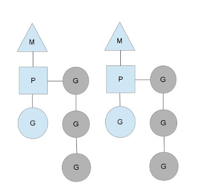 Here we see 2 threads (M), each holding a context (P), each running a goroutine (G). In order to run goroutines, a thread must hold a context.