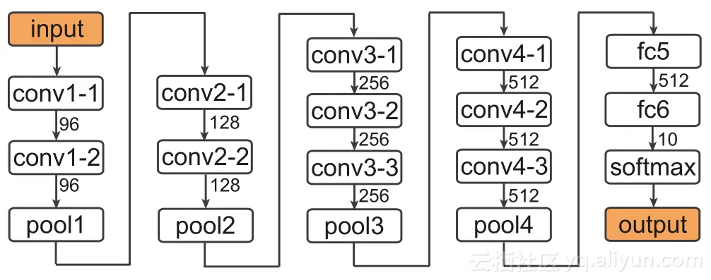 BaseCNN。 首先设计了包含10个卷积层,4个池化层和2个全连接层的卷积神经网络BaseCNN,使用普遍的ReLU激活函数,普遍的损失函数交互熵。网络结构如图10所示。将该网络用于CIFAR10数据库中,在测试的时候实现了11.32%的错误率。