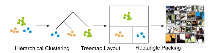 布局。构想图片快的布局作为矩形填充的问题,目标是将给定的矩形填充到最小区域的包围矩形。采用混合填充算法,该算法主要分为以下三个步骤,详细过程请见原文。