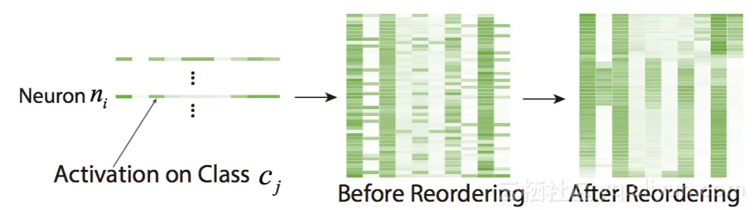 计算神经元的学习特征。采用矩阵填充技术,将群簇内神经元的输出图像填充成一个矩阵来表示该群簇特征。同时,为了方便用户分析每个神经元在不同类别上性能,采用矩阵形式来表示此类信息。一个群簇用一个矩阵表示。在矩阵中,每一行表示一个神经元,每一列表示一个类别,颜色的深浅表示该神经元在该类别上的判别能力(如图6所示)。为了更好的表现出该群簇的特点,对矩阵中的行进行了重排序,最大化邻近的两个行的相似性之和。