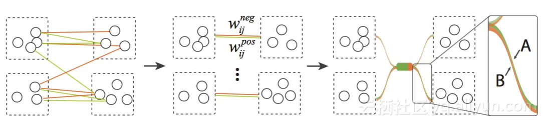 提出了基于双边聚类的边捆绑技术。此处的双边分别指两层之间输入的边和输出的边。如图9所示,双边聚类之后,对每个聚类结果分别进行边捆绑操作。图中,绿色表示边的权值为正,红色表示其权值为负。