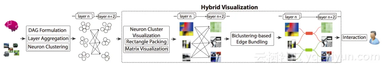为了有效的表示一个大的CNN网络,DAG制定模块在每一层聚类神经元。然后送入到神经元聚类可视化模块,该模块使用矩形填充算法去展示每个神经元的学习特征。之后基于双聚类的边缘捆绑减少视觉混乱。