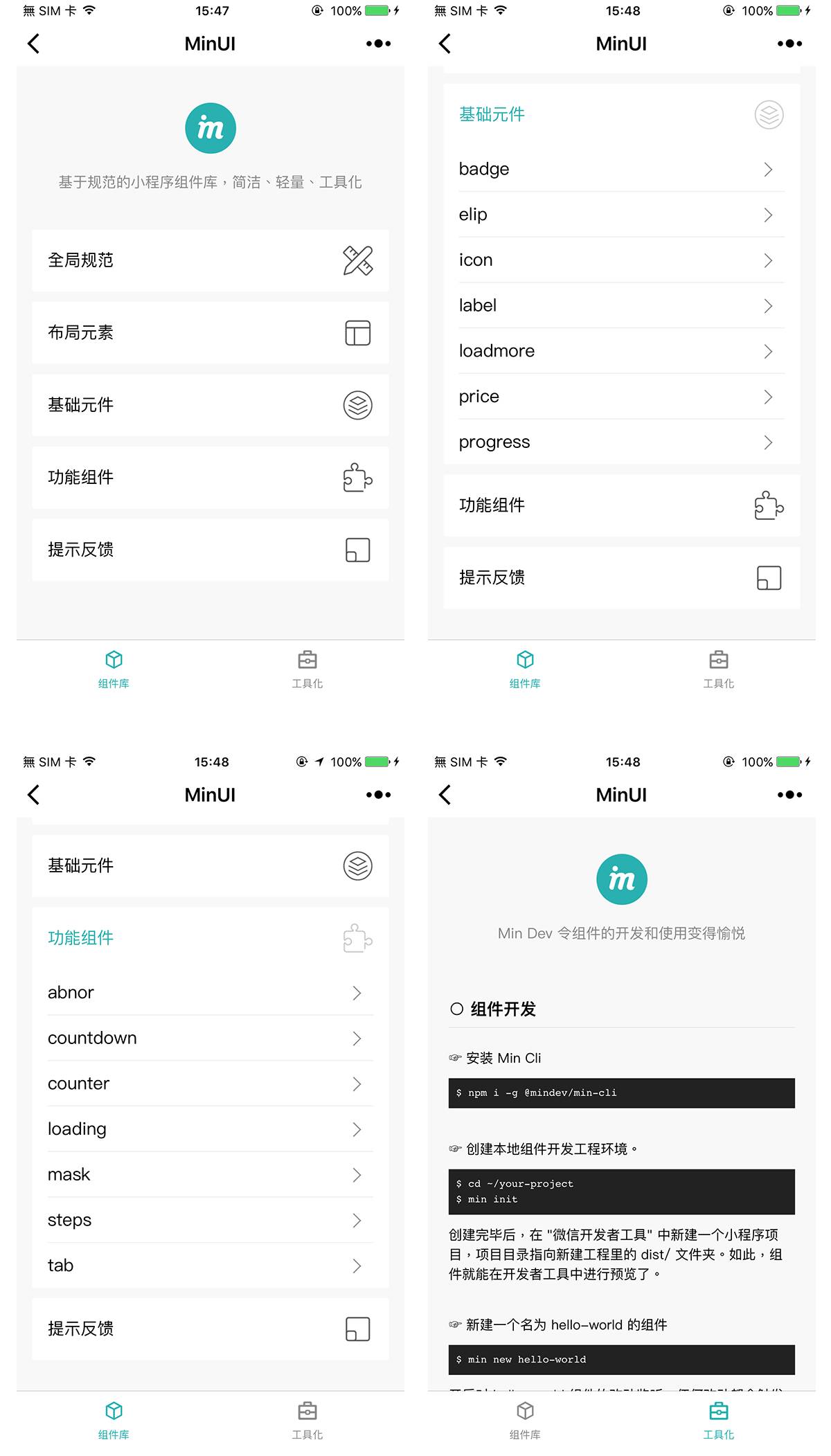 对于组件的应用,Min 提供了在原有的应用项目中,一键式安装、一键式更新组件的能力。并提供了渐进增强的诸如应用全局变量、全局模板等能力支持。后续我们还将以插件化的方式,提供诸如代码检测、单测环境等能力支持。