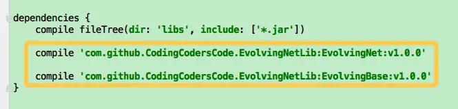 上图中依赖了两个类库,均属于Evolving系列,其中com.github.CodingCodersCode.EvolvingNetLib:EvolvingNet:v1.0.0为网络类库,而com.github.CodingCodersCode.EvolvingNetLib:EvolvingBase:v1.0.0为Base类库,结合了RxLifeCycle实现了RxJava生命周期的管理,以避免内存泄漏问题,其中EvolvingBase还提供了一个简单的懒加载Fragment实现。