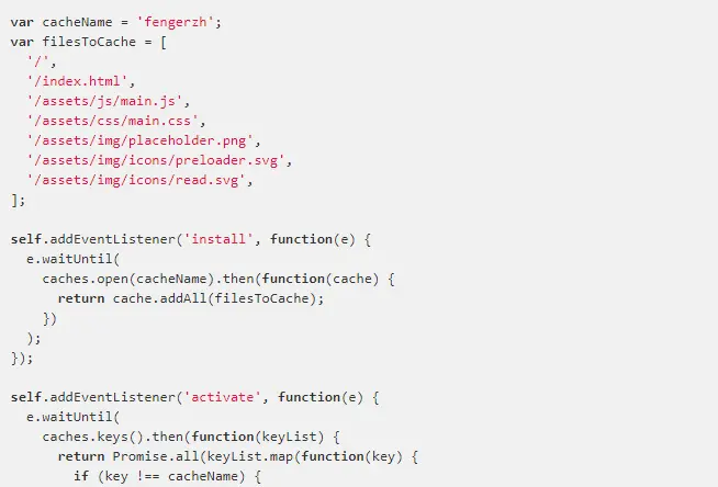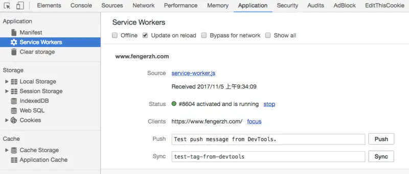 把指定的文件保存在缓存中,这样下次如果网络不通的话,浏览器会从缓存中取文件,而不会出现网络不通的画面。建好了ServiceWorker文件的页面,会在Chrome工具栏里看到这样的效果: