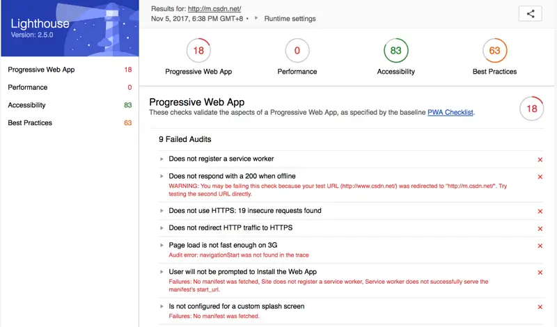 更强大而严格的工具还是Google推出的Lighthouse。这也是一款浏览器插件,不过目前只能用于Google自家的Chrome浏览器。它从4个方面对任何网站进行评测,包括性能、易用性、最佳实践。我们下面将重点介绍如何能在这4个方面都完全满足Google的要求。