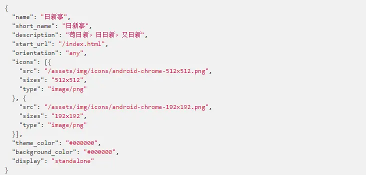 首先,你的网站必须要有一个manifest.json文件,这个文件里描述了最基本的一些信息。比如我的网站的manifest.json文件是这样的: