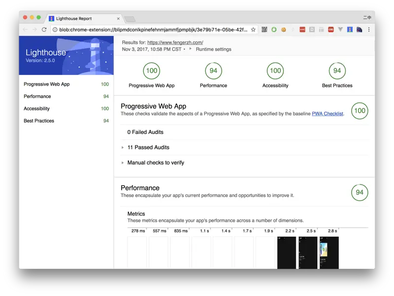 如果你完成了以上的所有优化步骤,相信你的网站应该可以得到一个比较高的评分了。现在我们随便找个网站评测一下看看吧,别人家的网站效果大抵都是这样的: