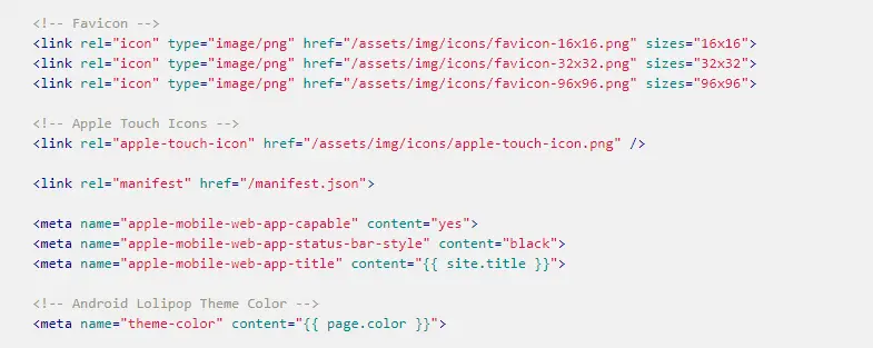 这里要注意的是你必须事先准备好你的网站的Logo图标,而且尺寸必须是512x512的。另外,这里设定的主题颜色必须和页面中的颜色相一致。在各页面的头部需要添加以下代码行: