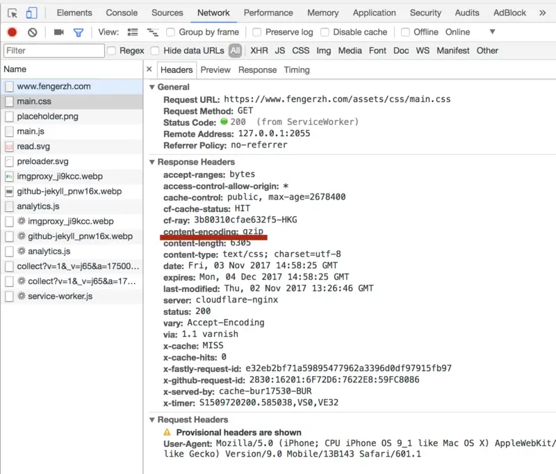 这一项主要是检查你的nginx服务器是否设置了gzip压缩传输的方式。打开你的Chrome开发者工具,检查Network标签里每一个请求的Response header,看一下是否有content-encoding: gzip,如果没有,说明你的网站没有设置gzip传输。