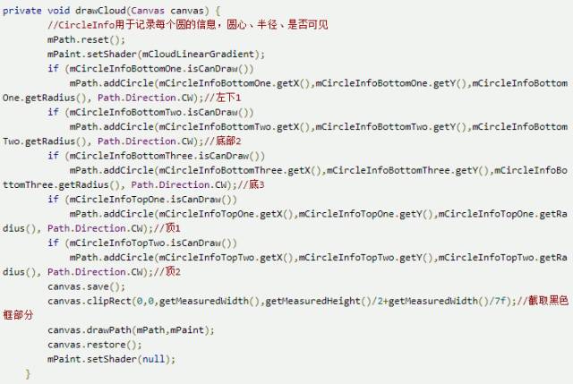 白云颜色变幻效果也是通过Shader实现的。在这里通过Path添加各个圆进路径,然后通过Shader绘制整个路径。