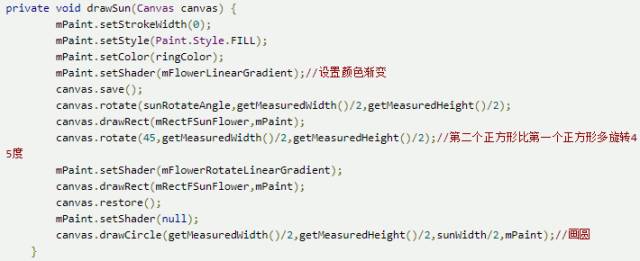 这里我们可以先画第一个绿色的正方形,然后画第二个红色的正文形,这里通过一个变量sunRotateAngle来控制两个正方形的旋转,从而实现太阳的旋转,第二个红色的正方形旋转总是比第一个多45度,从而错开,形成8角太阳花边的效果。最后绘制圆形。