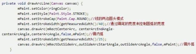 细心的小伙伴可能已经发现了,画外弧和内弧的参数还像有点不太一样。因为内弧是顺时针旋转,外弧是逆时针旋转的,为了保证弧转动到某一点后不再移动,我们做了处理,内弧以逆向的思维来做。(可以编写代码试下这么做有什么好处)