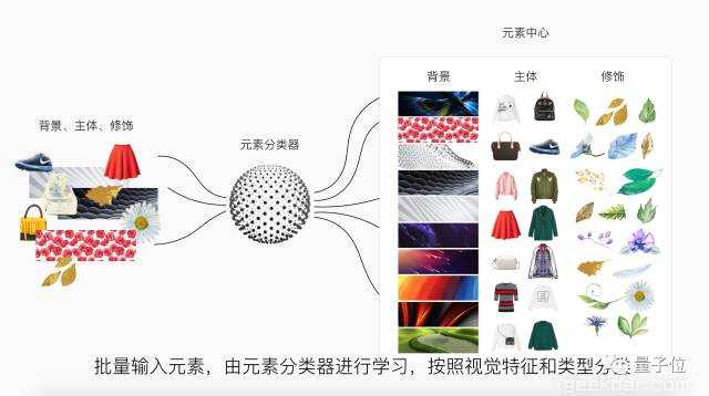 在设计框架的同时,元素中心也在批量输入元素(如底图,主产品图、修饰元素等),由元素分类器进行学习,按照视觉特征和类型分类。