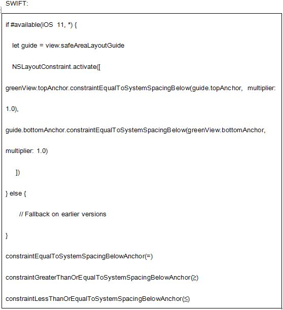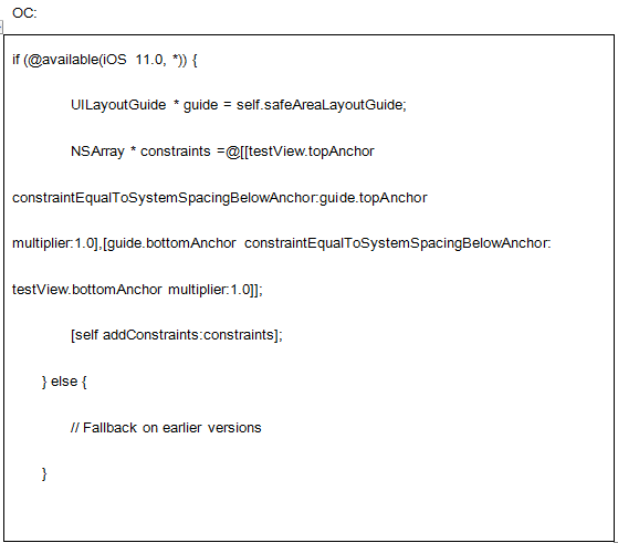 故事板自动将顶部和底部布局指南替换为安全区域,并更新约束。如若使用代码进行自动布局时,可以进行如下编码
