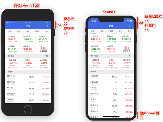 iPhone X以外的机型导航栏的高度是64,其中statusBar的高度为20,而iPhone X的statusBar高度变为了44,如果是自定义的navigationBar,这部分需要做相应的适配。