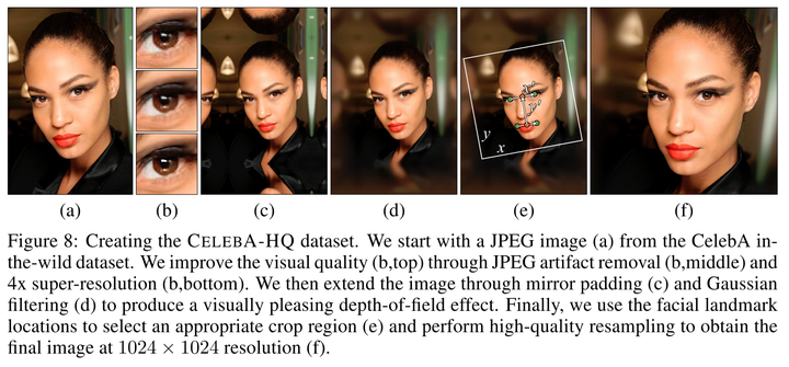 这么好的效果,与数据也是分不开的。通过super-resolution,模糊背景,对齐,生成CelebA-HQ数据集用于训练: