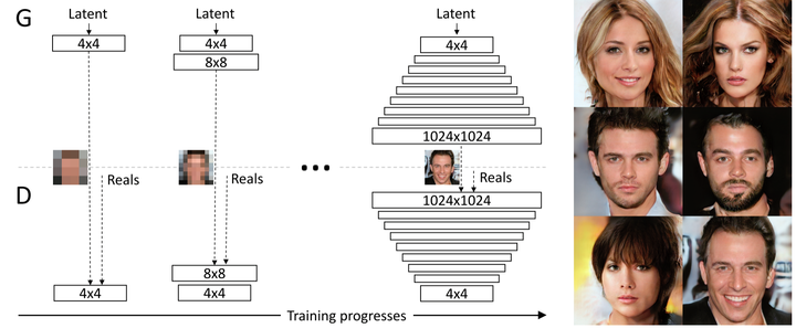 通过使用逐渐增大的GAN网络(先训练4x4,然后训练8x8,然后... 直到 1024x1024),配合精心处理过的CelebA-HQ数据集,实现了迄今最真实的GAN效果。