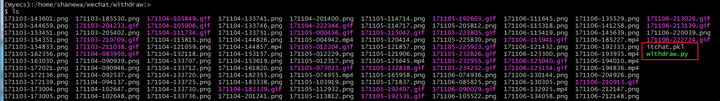 可以看到我用红框框出来的两个文件,其中itchat.pkl是登录的临时文件,有这个文件脚本才能热登陆,绿色的就是脚本,其他的以17开头的都是撤回消息的缓存,尤其图片: