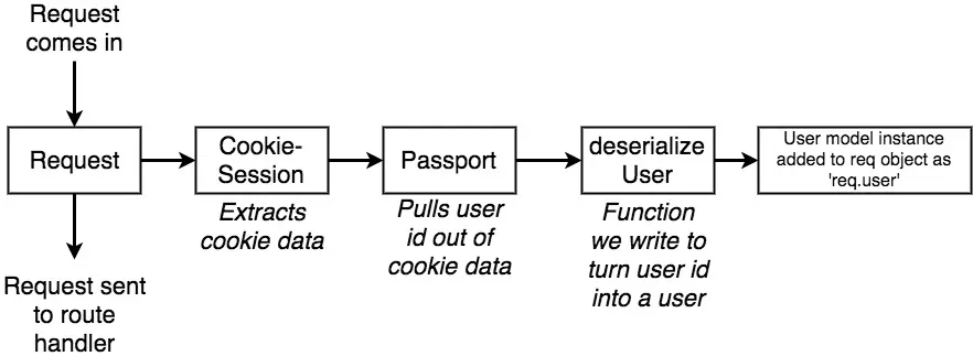 app.use。我们知道express app的作用就是接受请求,并给出响应。app.use中传入的是function,这些function叫做中间件,作用是修改接收的请求,然后再把它传递给实际处理请求的route handler。对于所有请求通用的逻辑比较适合写在中间件中,比如这里的验证用户的逻辑。因为很多请求都需要验证用户的身份才能给出合适的响应,与其在每个route handler都写相同的逻辑(读cookie->解密->反序列化->拿到user model实例),我们把逻辑写在中间件中,所有的请求都会走一遍。这里我们实际用到了两个中间件的逻辑,一个是cookie-session,一个是passport。 - cookie-session作用是从请求中拿到cookie并解密,那它是如何把解密后的cookie传递给passport的呢?如果我们把