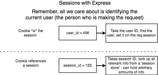 - express官方推荐处理的cookie的库有两个,一个是我们这次用的cookie-session,另一个是express-session,这里主要讲一下二者的区别:就是用户信息存储方式不同。在cookie-session中,cookie就是session,也就是说cookie中包含了session的所有信息。