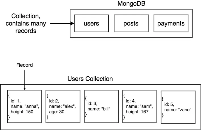 - MongoDB是一个基于文档(document)的数据库。在MongoDB中,数据是以Collection的形式来组织的,也就是一个Collection代表一种数据。一个Collection中的每条记录(document/record)不必拥有相同的字段,也就是说我们可以动态地为数据添加、减少或者修改字段。如下图所示,不同的User记录具备可以拥有不同的字段。