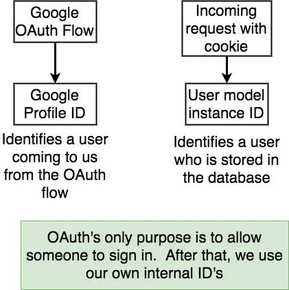 - 这里传入的参数user正式我们在从数据库取到(创建)一条用户信息后传递给done函数的值。实际上就是数据库中的用户信息。这里的user.id是数据库自动生成的id,而非googleId。原因有两个:1、我们可能会用到不同的验证方法(Facebook、Wechat等),不同系统下采用profile.id无法保证唯一性;2、这里我们使用googleId的唯一作用就是为了授权登陆,登陆后的一切请求都与googleId无关,所以之后请求中携带的cookie信息(正是这次序列化所生成的)应该包含数据库id而非googleId。