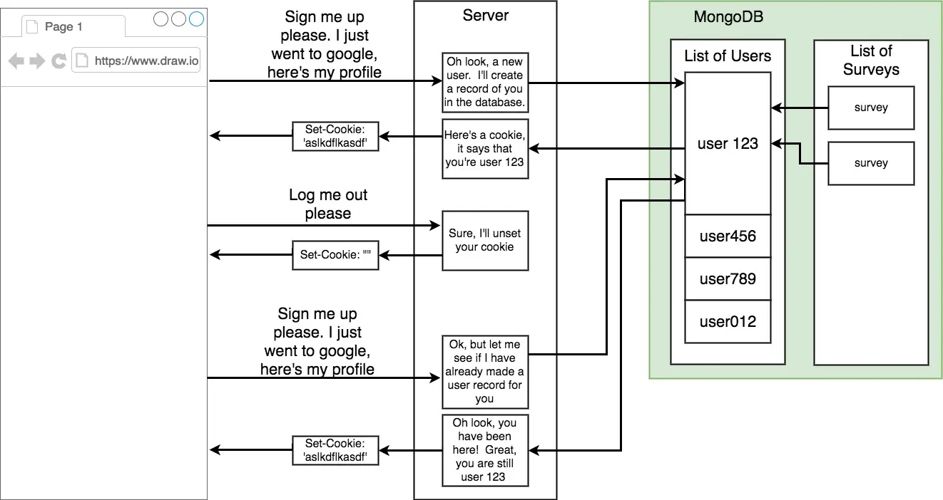 - 这里看一下我们所处的状态和接下来要做的事情。首先我们有了用于存储数据的MongoDB和用于操作数据的mongoose。接下来我们要对访问的用户进行检查,检查他们是否在我们的存储记录中,如果在就让他登陆,如果不在点击授权,我们用授权返回的GoogleID为内容创建一条新的记录,那么当用户下次进入网站的时候就不必再次授权了。