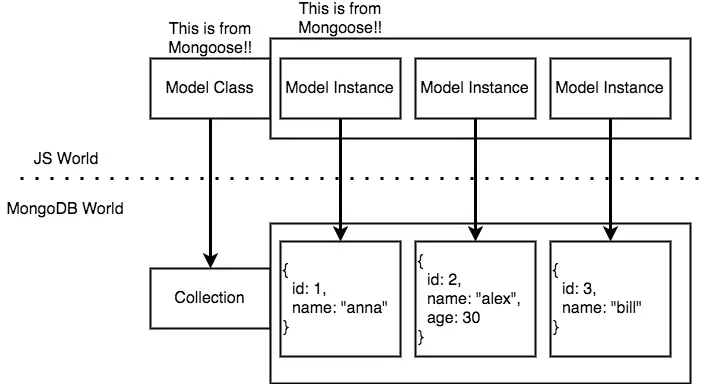 - 我们使用mongoose来进行数据库的操作。这其中包括两个部分:js和数据库。js部分每个Model Class对应数据库部分的每个Collection,js部分的每个实例对应数据库部分的每条记录(record)。
