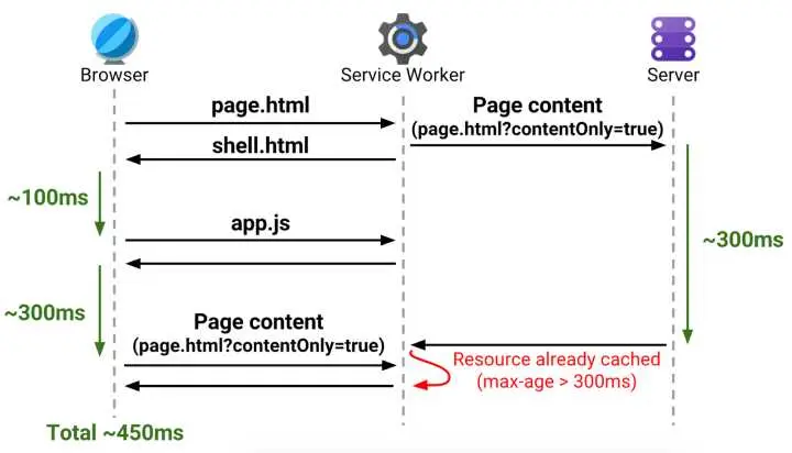 在 SPA/MPA 架构的应用中,App Shell 通常包含在 HTML 页面中,连同页面一并被预缓存,保证了离线可访问。但是在 SSR 架构场景下,情况就不一样了。所有页面首屏均是服务端渲染,预缓存的页面不再是有限且固定的。如果预缓存全部页面,SW 需要发送大量请求不说,每个页面都包含的 App Shell 部分都被重复缓存,也造成了缓存空间的浪费。